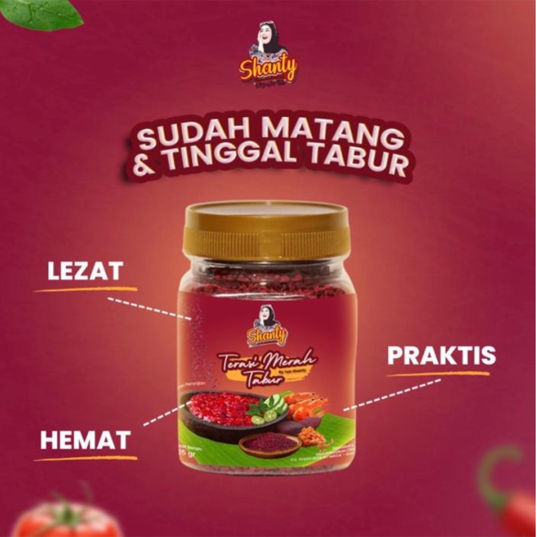 Terasi Merah Tabur Teh Shanty bumbu masak khas Garut (Sunda). Terbuat dari ikan dengan tambahan udang rebon berkualitas yang terfermentasi, dan diinovasikan dalam bentuk bubuk.